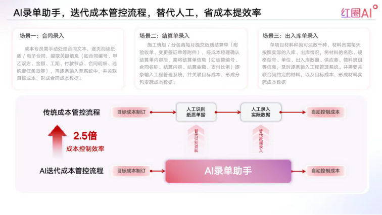 過去,成本專員要逐頁閱讀紙質(zhì)合同,手動錄入編號、金額、工期等信息;材料員要每天逐條輸入上千種材料的出入庫數(shù)據(jù),不僅耗時還易出錯。AI 錄單助手通過圖像識別技術,能自動提取合同、結(jié)算單、出入庫單上的關鍵信息,“秒級” 回填到系統(tǒng),徹底解放基層員工的重復勞動。這不僅解決了 “基層負擔重、數(shù)據(jù)錄入不準” 的痛點,還從源頭保證了數(shù)據(jù)質(zhì)量,為后續(xù)的分析決策打下堅實基礎。