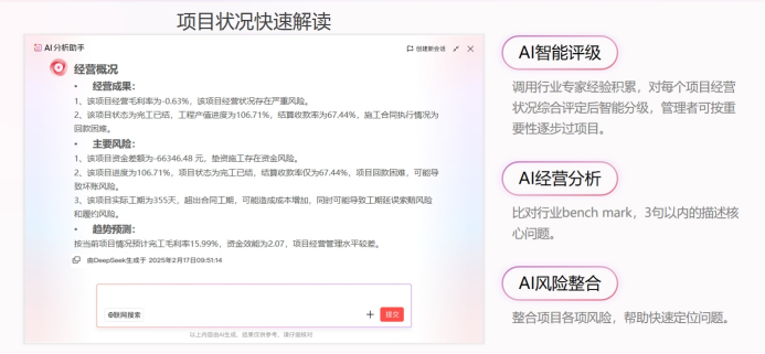 紅圈AI系列智能產(chǎn)品中的項目360°AI解讀,通過整合全維經(jīng)營指標(biāo),一鍵生成項目全景作戰(zhàn)圖,讓復(fù)雜數(shù)據(jù)轉(zhuǎn)化為清晰決策語言。該功能能夠?qū)椖拷?jīng)營狀況進(jìn)行智能評級,并整合各項風(fēng)險,幫助管理者快速定位問題。通過結(jié)構(gòu)化呈現(xiàn)項目關(guān)鍵信息、收支分析、資金分析和成本構(gòu)成等數(shù)據(jù),項目360°AI解讀使項目進(jìn)度監(jiān)控更加精準(zhǔn)高效。這種透明化的進(jìn)度跟蹤,不僅提高了項目執(zhí)行效率,也降低了因延期導(dǎo)致的額外成本。
